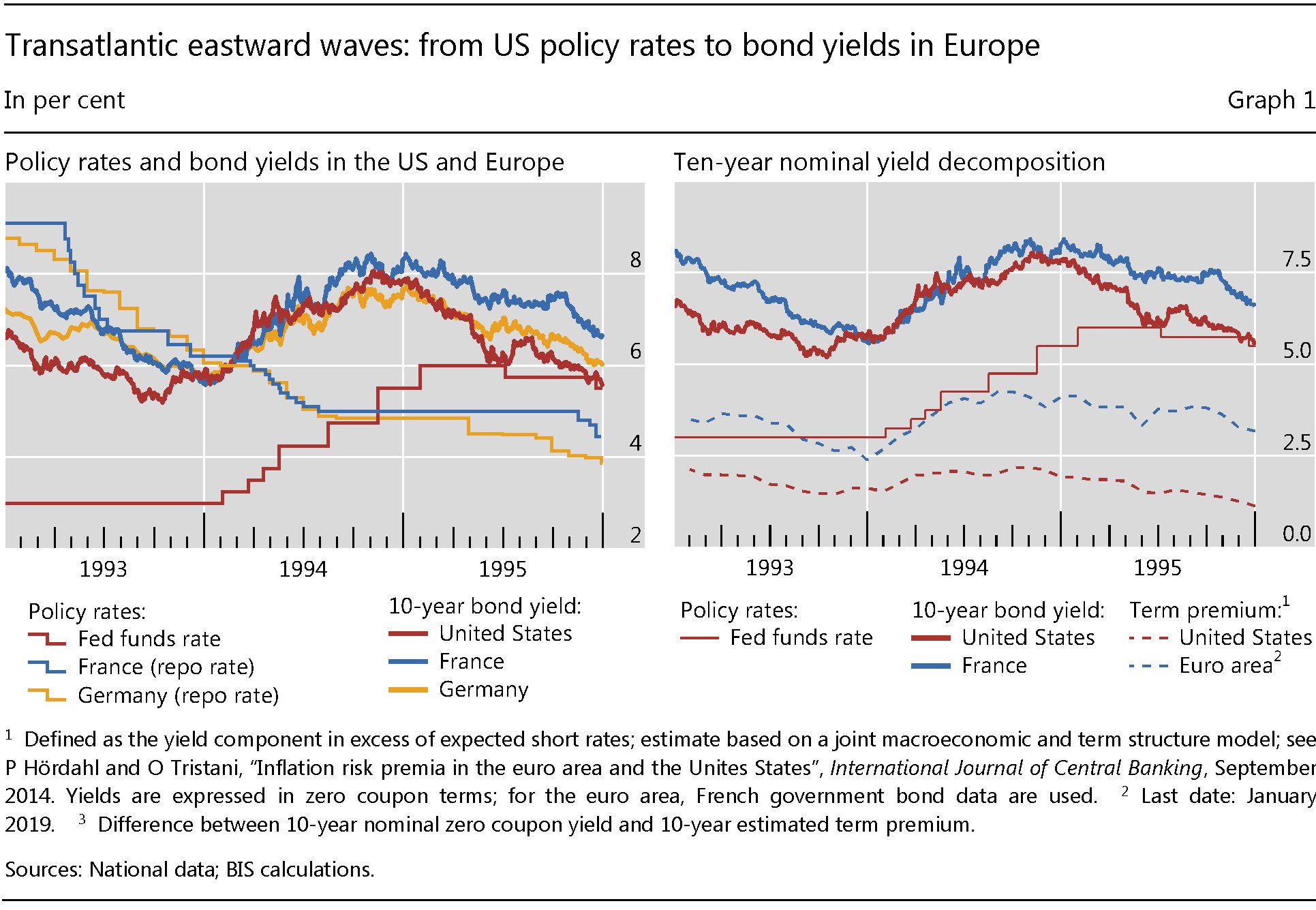 La cosa interessante da osservare è che il movimento globale non risparmiò neanche l’Europa, malgrado le condizioni monetarie fossero rimaste le stesse sia in Francia che in Germania, ossia in fase di allentamento. “L’ampliamento del premio a termine europeo – la componente di rendimento superiore ai tassi a breve attesi – ha spinto i rendimenti dei titoli europei a seguire i rendimenti degli Stati Uniti”, osserva Borio, “e questo nonostante le divergenze ovvie nelle politiche monetarie”.