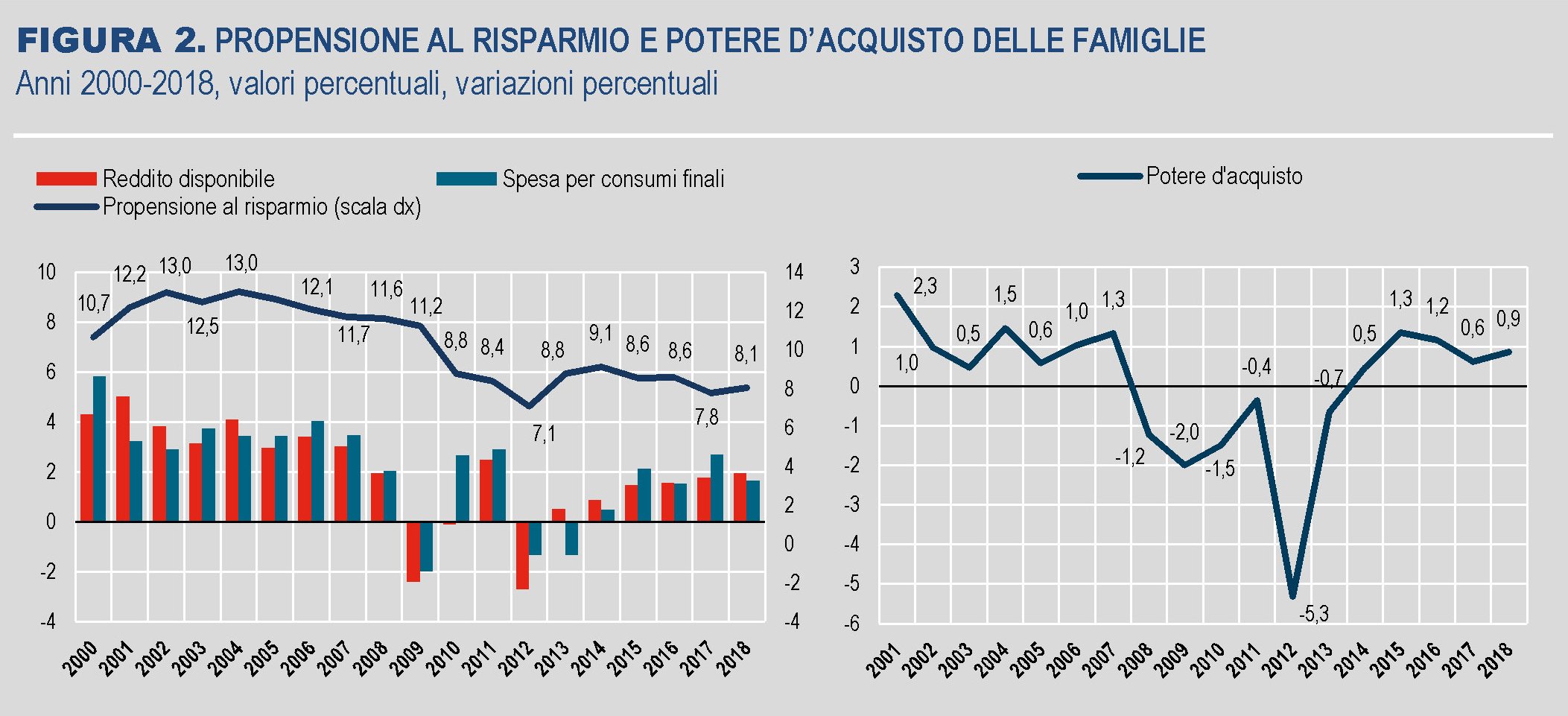 Guardate bene che ci sono un sacco di informazioni sopra. Per dire: vedete quell’istogrammino blu nel 2018 del grafico di sinistra che misura la spesa per consumi finali? Noterete che va in senso inverso alla curva del risparmio.