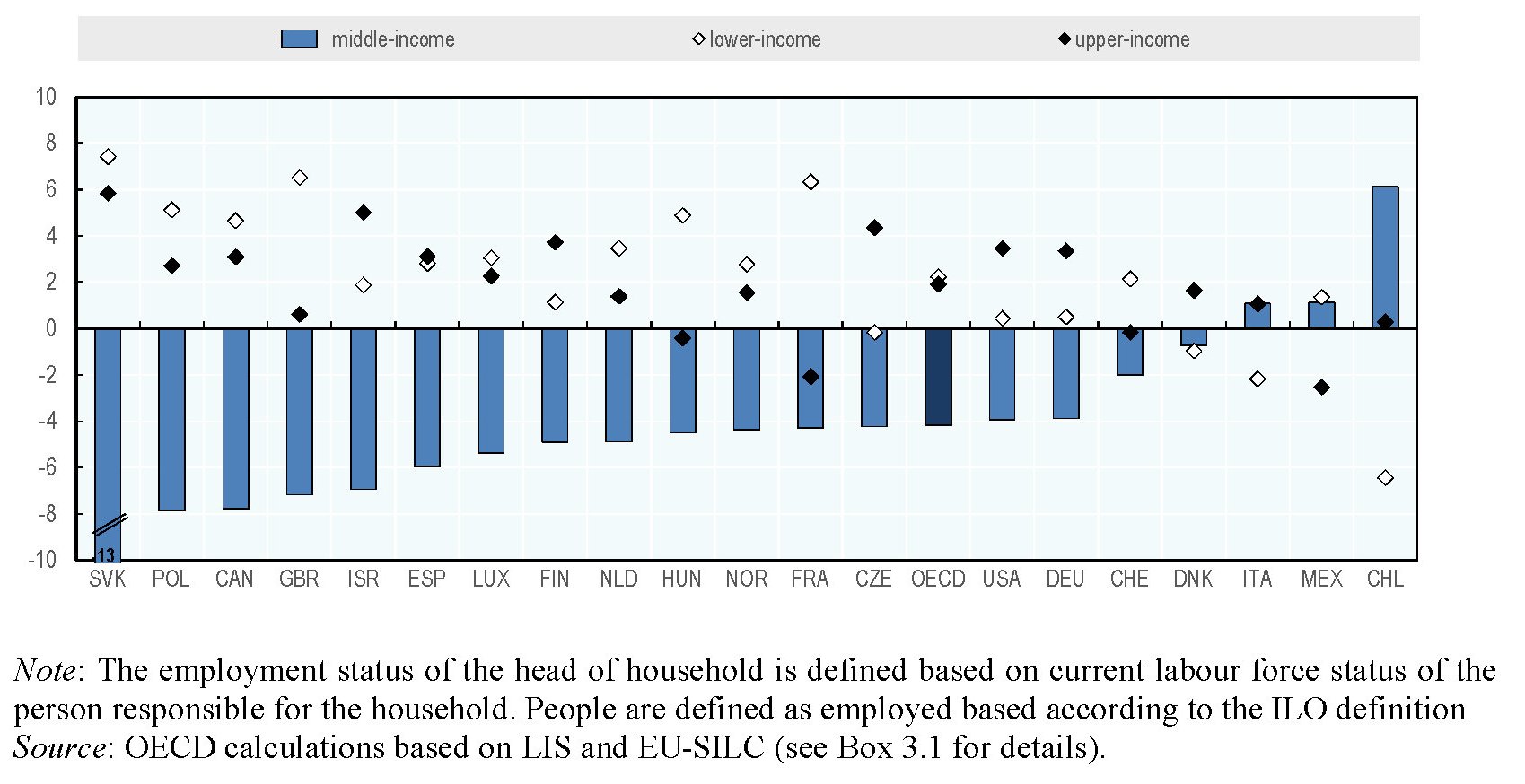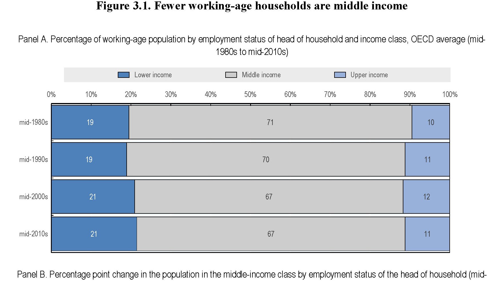 Come si può osservare, l’Italia è uno dei pochi paesi (insieme a Messico e Cile) ad aver registrato un aumento dei lavori da classe media, diciamo così, a fronte di cali generalizzati in tutti gli altri. E soprattutto si è registrato una crescita della quota dei redditi più elevati (upper income) a fronte di una notevole diminuzione di quelli più bassi (lower income). Insomma, la narrativa Ocse sul declino della classe media, con tutti i suoi annessi e connessi che abbiamo già discusso, sembra si attagli poco al caso italiano. E tuttavia abbiamo finito col diventare un caso di scuola del populismo contemporaneo. Forse dovremmo cambiare punto di vista. O almeno iniziare a nutrire qualche dubbio.