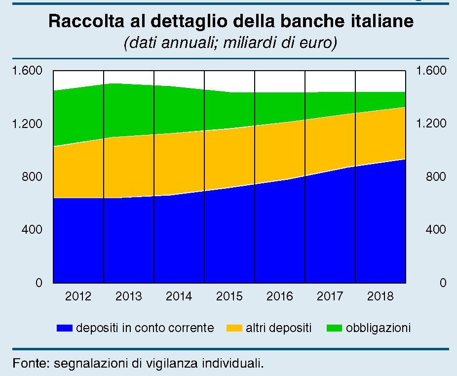 Come si può osservare la quota delle obbligazioni sulla raccolta bancaria, ossia i denari con i quali la banca si finanzia, si è ridotta moltissimo fra il 2011, quando quotava 422 miliardi, e il 2018, quando ne rimangono ormai solo 87. Poiché la quota di raccolta al dettaglio, ossia quella raccolta sostanzialmente fra i clienti, è rimasta stabile intorno al 60%, significa che c’è stata una profonda ricomposizione (anche questa chiaramente osservabile) delle fonti della raccolta. In pratica le obbligazioni si sono trasformate in depositi di conto corrente, che “a fine 2018 rappresentavano il 73% dei depositi di famiglie e imprese contro il 43 e il 66% di Francia e Germania”, spiega Bankitalia.