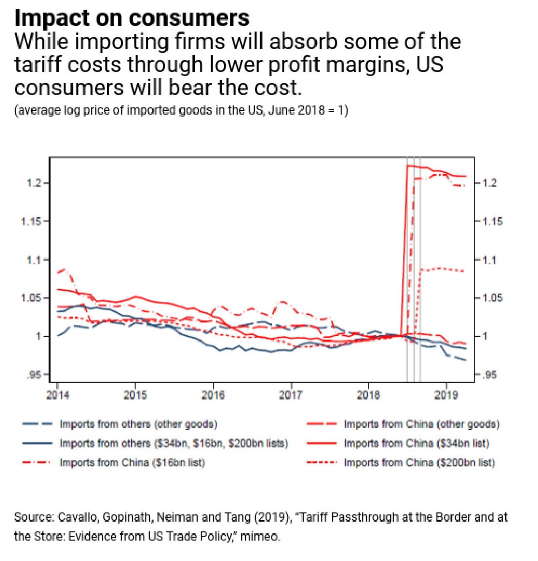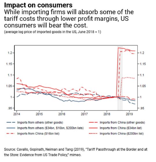 Lato consumatori, risulta evidente che “sia negli Usa che in Cina sono i perdenti della tensioni commerciali”. Il costo delle tariffe è stato innanzitutto sopportato dagli importatori – è utile ricordare che l’economia Usa utilizza molti semilavorati per le sue produzioni – e in diversi casi il costo è stato trasferito sul consumatore finale, in altri sui margini di profitto delle imprese.