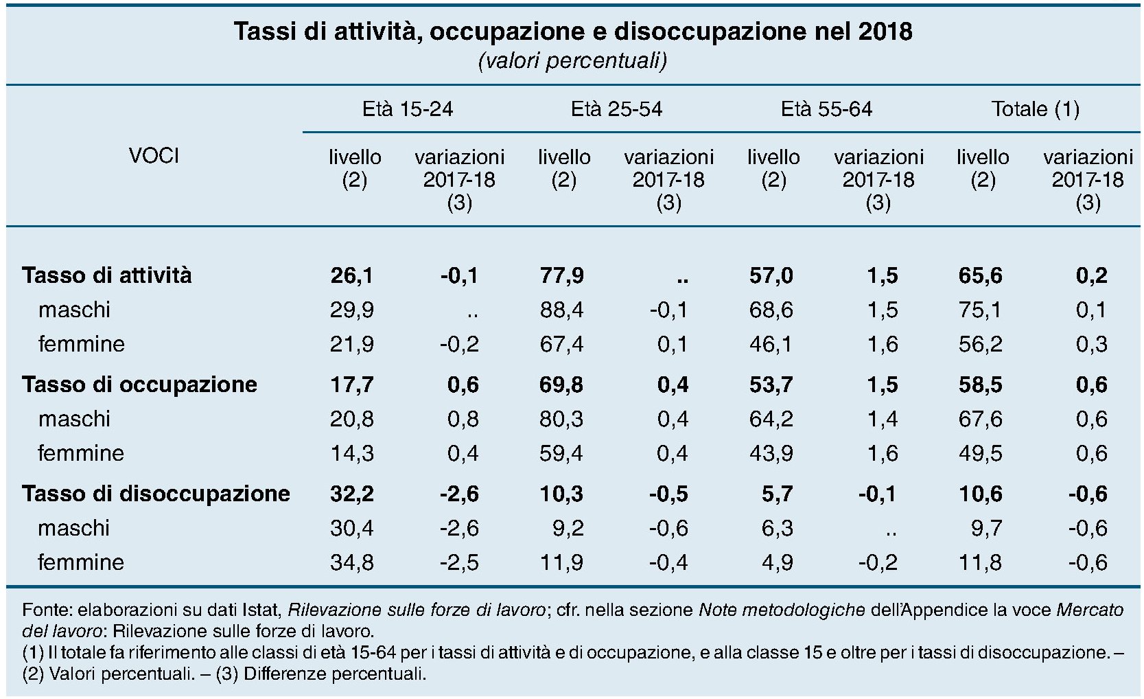 In statistica queste grandezze vengono misurate dal tasso di attività, che è il rapporto tra la forza lavoro (occupati+disoccupati) e la popolazione in età lavorativa, quello di occupazione, che è il rapporto fra il totale degli occupati e la popolazione in età lavorativa, e quello di disoccupazione, che è il rapporto fra le persone in cerca di lavoro e la forza lavoro. Utile ricordare questi concetti perché ci consentono di comprendere meglio la tabella proposta da Bankitalia, che è articolata per classi di età.