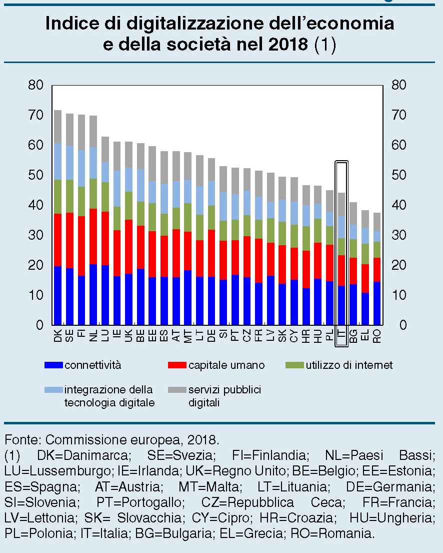 Poiché tutto si tiene, non dovremmo stupirci che al livello di istruzione ancora carente nel nostro paese corrisponda un notevole ritardo digitale che ha effetti deprimenti sul nostro mercato del lavoro e sulla produttività delle imprese. E stendiamo un livello pietoso sulla qualità dei nostri servizi. Gli italiani sono molto indietro, come ci ricorda Bankitalia nella sua ultima relazione annuale, e il confronto con gli altri paesi europei è scoraggiante.