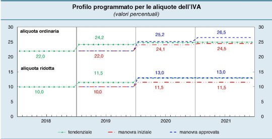 L’aumento dell’Iva, che tutti dicono di voler evitare, per il momento sta scritto sull’ultima legge di bilancio che, come le altre precedenti, ha rimandato il problema all’anno prossimo, ma peggiorandolo. Le aliquote dell’aumento, infatti, sono state aumentate per evidenti ragioni di coerenza contabile, portando così le previsioni di gettito, dopo l’attivazione delle clausole di salvaguardia, a 22,7 miliardi nel 2020 e 28,4 miliardi nel 2021, ai quali sommare altri 400 milioni per le accise, rispettivamente 3,9 e 9,2 miliardi in più rispetto a quanto previsto dalla legge precedente.