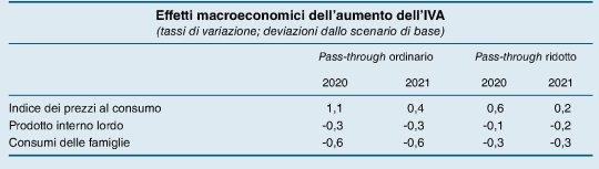 Nello sviluppo della sua simulazione Bankitalia distingue il caso di un pass-through ordinario, ossia di una traslazione dell’effetto Iva pari a circa l’80% in due anni, da un effetto ridotto, quindi più ritardato e diluito nel tempo degli aumenti. In ogni caso, gli effetti macroeconomici sarebbero rilevanti.