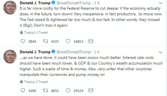 Dite che c’entra qualcora Mister T.? D’altronde è solo da un semestre che bombarda la Fed di Tweet. Ma non è tanto questo il punto quanto la circostanza che dieci anni dopo stiamo un po’ meglio e un po’ peggio. Abbiamo la crescita, ma agli Usa servono i tassi bassi. E noi allora? Noi italiani abbiamo i tassi bassi ma non abbiamo la crescita!