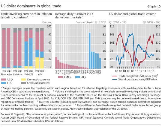 Ciò per dire che i paesi emergenti hanno imparato la lezione degli ultimi trent’anni, al punto di darne pure a noi “esperti”. Infischiandosene bellamente dei sacri testi che predicano cambi flessibili e target di inflazione da raggiungere attraverso la manovra dei tassi di interessi, le loro banche centrali intervengono ogni volta che gli serve sul mercato dei cambi. E così facendo si difendono dalle oscillazioni del dollaro, che denomina gran parte del loro commercio internazionale (grafico sotto, tabella di sinistra) – per tacere dei prestiti esteri – e quindi li espone a un costante rischio cambio che deve essere gestito, sempre per non ripetere copioni già visti.