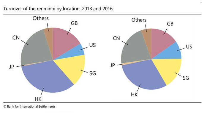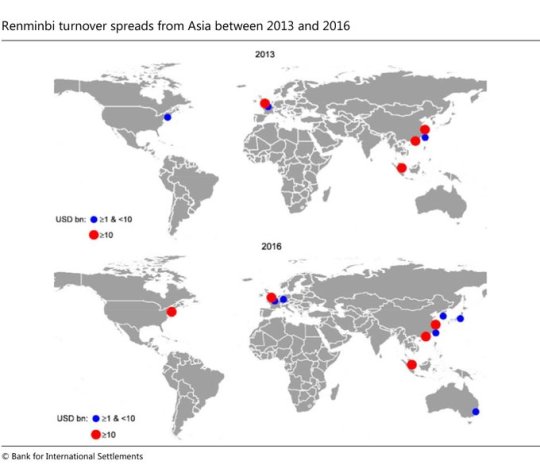 Tenere presente queste considerazioni aiuta a mettere a fuoco il significato di un paper pubblicato dalla Bis (“Geographic spread of currency trading: the renminbi and other EM currencies“) dove si analizza l’andamento della moneta cinese mettendo a confronto la sua diffusione internazionale fra il 2013 col 2016.