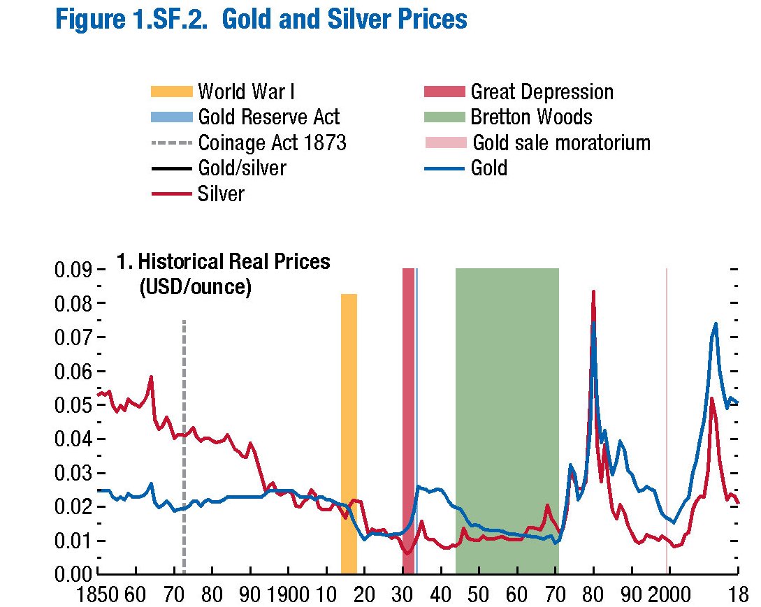 Chi volesse nutrire certe suggestioni mitologiche, potrebbe trarre ispirazione dagli andamenti secolari del prezzo dell’oro, che a dispetto di quanto si potrebbe credere, ha più valore oggi di quanto ne avesse un secolo fa, quando pure denominava la moneta (o forse proprio per questo). L’ultimo cinquantennio, poi, potremmo chiamarlo senza tema d’esagerare come la nuova età dell’oro, visto che il prezzo del metallo giallo è praticamente raddoppiato, in valore reale, rispetto a quello del dollaro, che perciò ha più che dimezzato il suo prezzo relativo. Con ciò osservando che nel picco massimo faustiano della moneta fiduciaria, che oggi ispira nuove mitologie digitali, l’oro suscita un apprezzamento crescente. E quindi, silenziosamente, si apprezza.