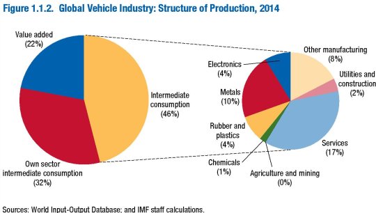Ci sono in gioco le complesse relazioni che legano moltissimi paesi fra loro, delle quali l’automobile – ossia il prodotto finale – è l’effetto visibile dietro il quale si agitano numerosissimi interessi. Basta osservare il grafico sotto che schematizza come sia organizzata la produzione in questo settore per farsene un’idea.