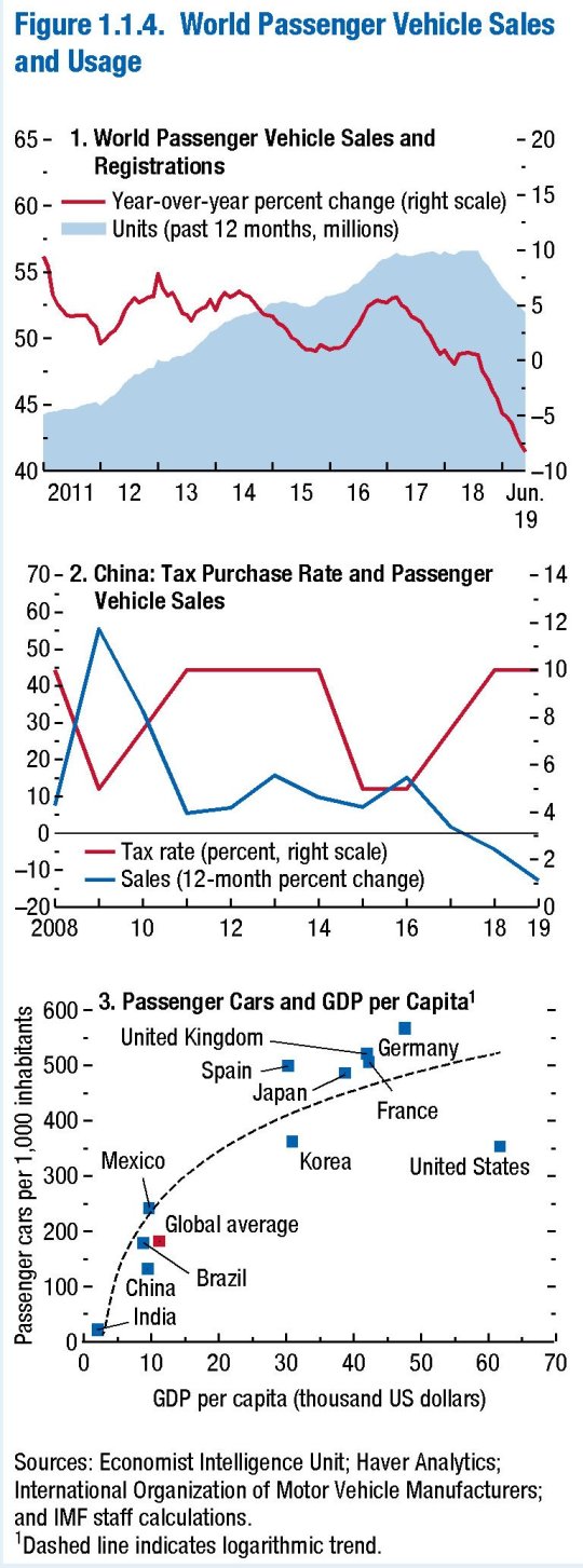 Il Fmi osserva che la produzione lorda del settore auto, definito come la somma del suo valore aggiunto con quello dei beni intermedi, pesa il 5,7% della produzione globale. Auto e componentistica correlata stanno al quinto posto nella classifica dei beni esportati, rappresentando circa l’8% delle esportazioni globali nel 2018. Il settore è inoltro un largo consumatore di commodity e l’industria auto è molto importante per i consumi di alluminio e acciaio, oltre ad avere un peso specifico non indifferente in quella della plastica, del rame e della componentistica elettronica. Tutte le strade portano all’auto, insomma.