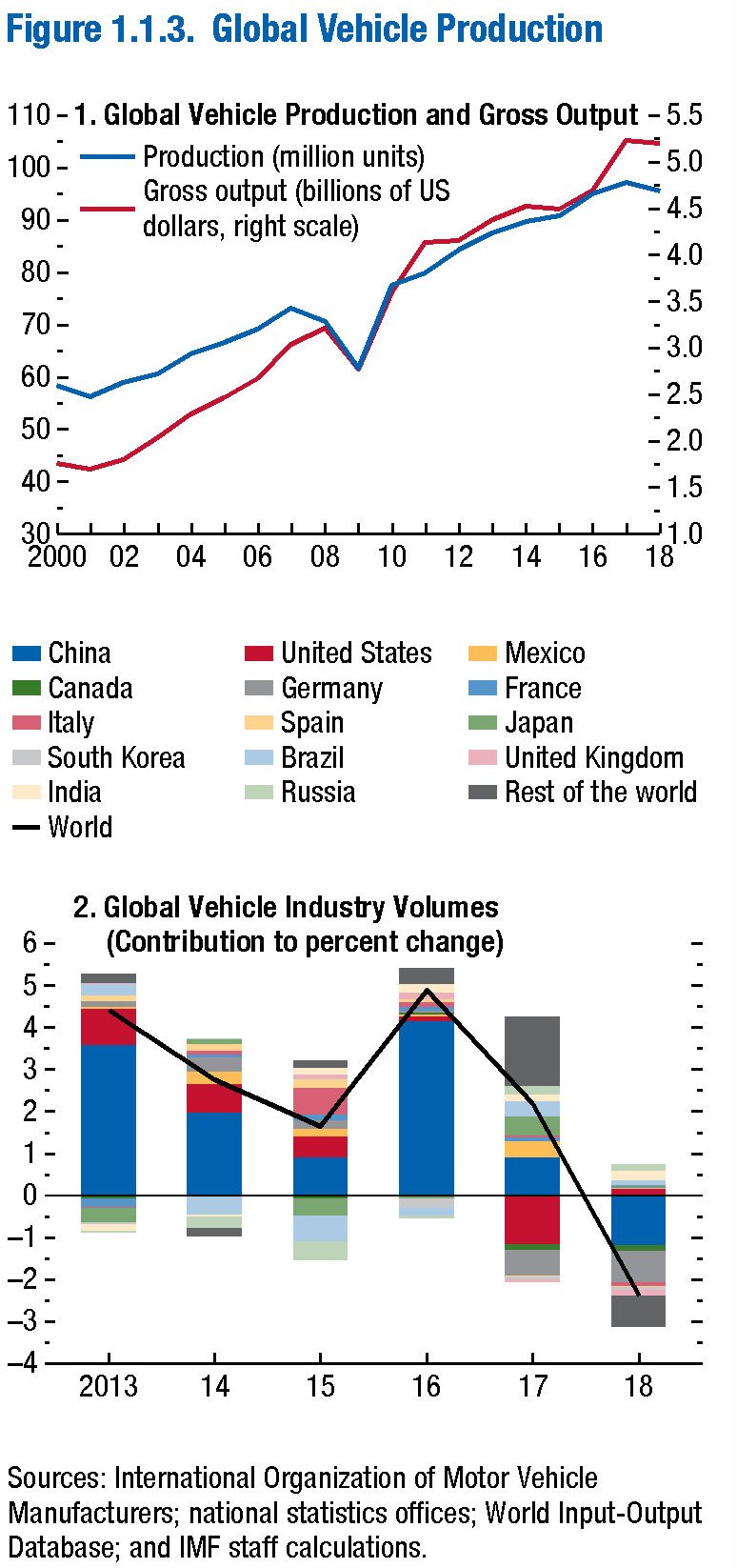 Il Fmi osserva che la produzione lorda del settore auto, definito come la somma del suo valore aggiunto con quello dei beni intermedi, pesa il 5,7% della produzione globale. Auto e componentistica correlata stanno al quinto posto nella classifica dei beni esportati, rappresentando circa l’8% delle esportazioni globali nel 2018. Il settore è inoltro un largo consumatore di commodity e l’industria auto è molto importante per i consumi di alluminio e acciaio, oltre ad avere un peso specifico non indifferente in quella della plastica, del rame e della componentistica elettronica. Tutte le strade portano all’auto, insomma.