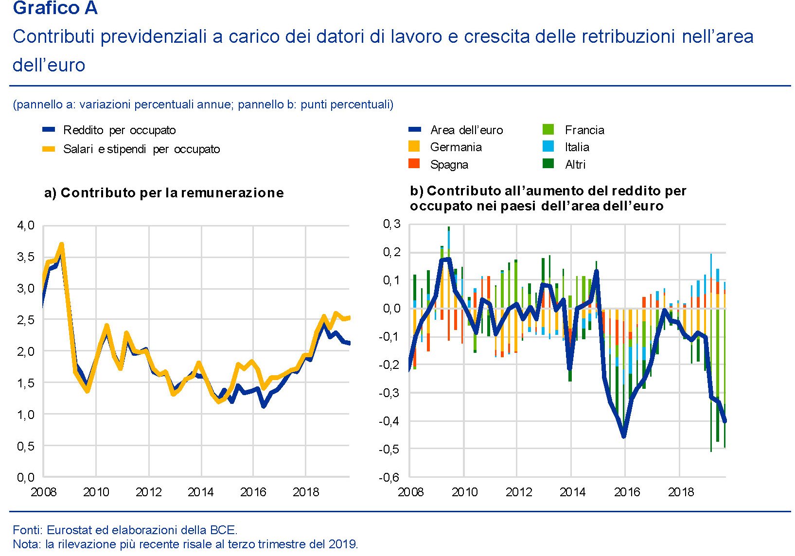 Per la Francia il calo dei contributi ha determinato che i redditi per dipendenti sono cresciuti più lentamente – del 2,3, del 2,2 e del 2,1% nei primi tre trimestri del 2019 – rispetto alle retribuzioni per dipendente (+2,6%, +2,5% e +2,5%). Ciò significa che bisogna sempre tenere presente questa distinzione – fra reddito per occupato e retribuzione – quando si osserva il mercato del lavoro per non incorrere in equivoci che mescolano le due voci non tendendo conto del cuneo fiscale generato dalla contribuzione obbligatoria.