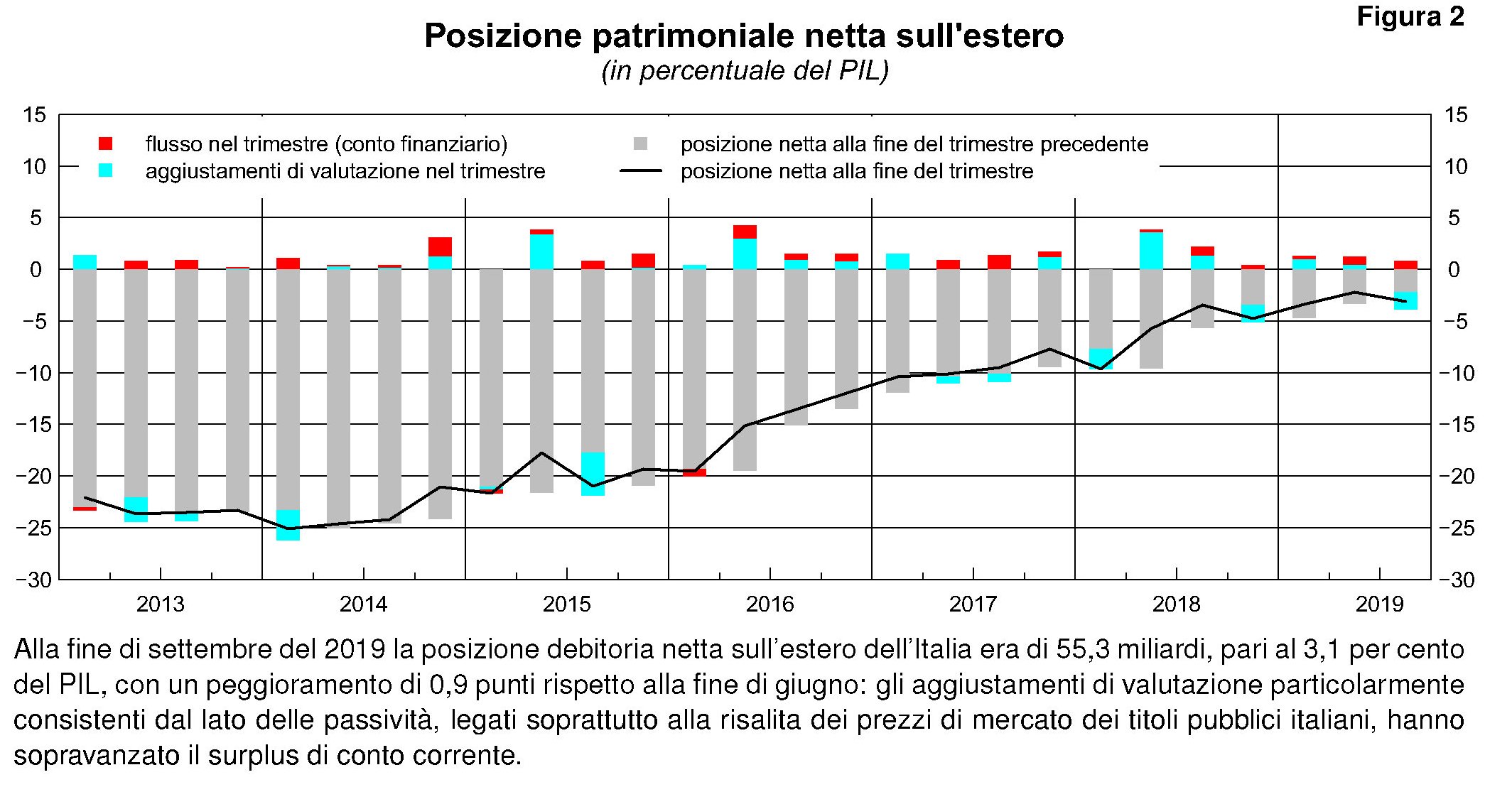 Ripeto: siccome i prezzi dei Btp si sono ripresi dopo i danni provocati dal cazzeggio del cambiamento, il debito estero italiano è peggiorato di quasi un punto di pil. Tanto che adesso il totale del debito ha superato l’incremento del conto corrente.