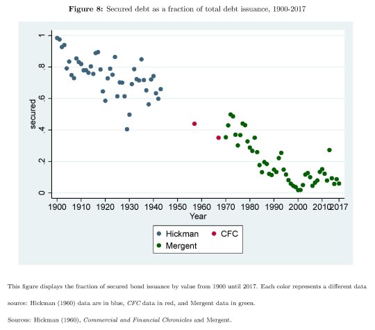 Un bel paper pubblicato dal NBER ci informa di un’altra delle tante, curiose, tendenze economiche emerse nel corso del secolo scorso che sembra caratterizzare anche quello nuovo: la sostanziale scomparsa del debito assicurato. Vale a dire delle obbligazioni garantite da collaterali sicuri – tipicamente asset reali – che la gran parte della letteratura economica giudica ottimali sia per il debitore, in quanto il collaterale lo aiuta a “piazzare” il proprio debito facilmente e a un costo inferiore, sia per il creditore che trova nel collaterale una garanzia robusta che lo mette al riparo da eventi avversi.