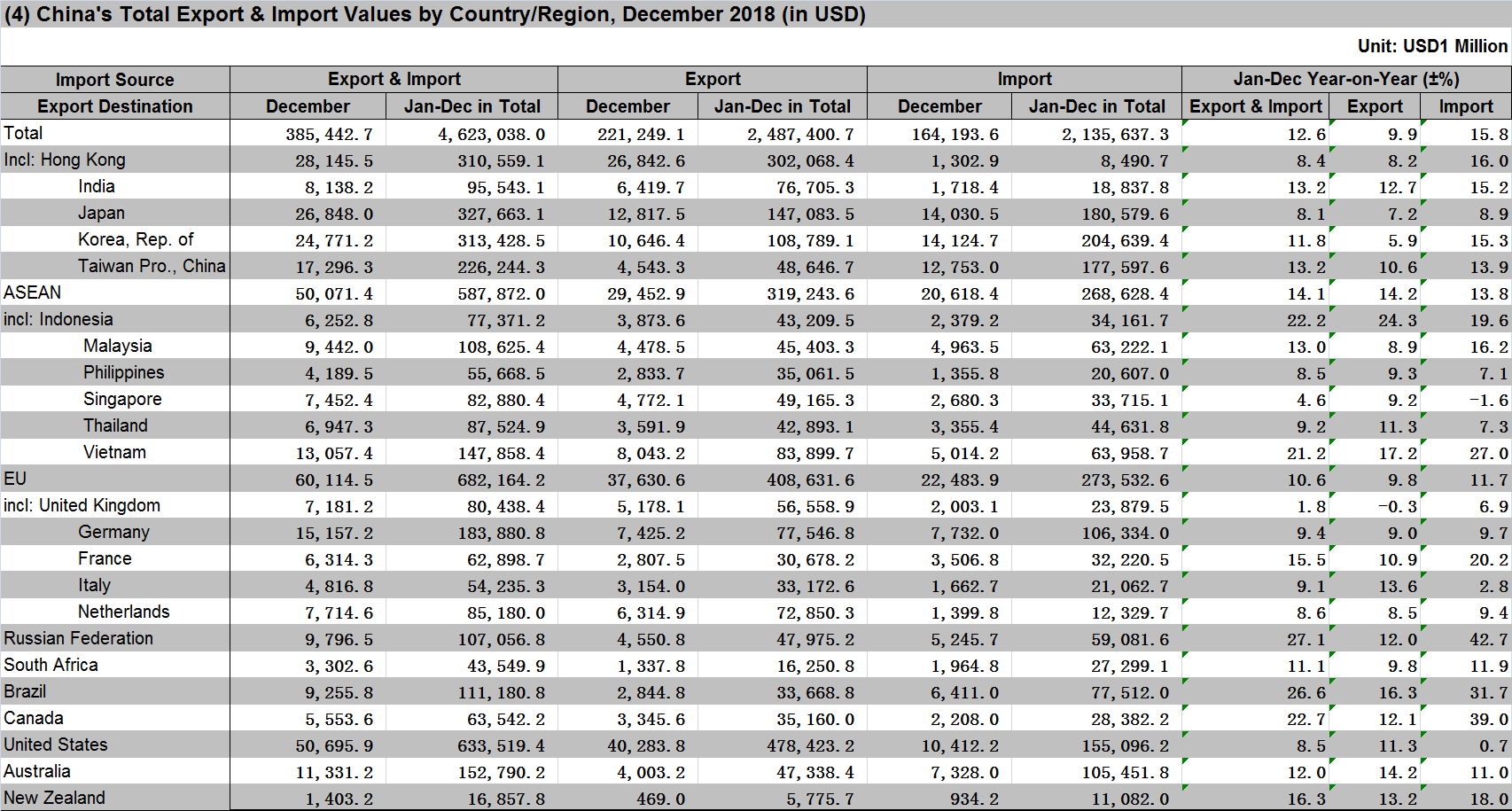 Il totale di export e import del 2019 è risultato di circa 4,575 trilioni di dollari, con export pari a 2,498 trilioni e import per 2,076. Il saldo 2019, quindi si colloca a circa 422 miliardi, in decisa crescita rispetto al saldo 2018, quando le esportazioni totali erano state pari a circa 2,487 trilioni e l’import 2,135, per un saldo di circa 350 miliardi.