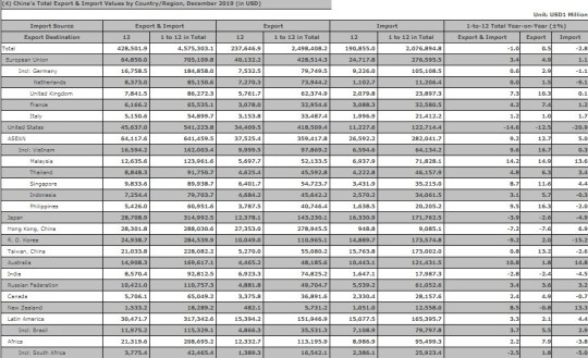 I dati diffusi dal governo cinese sul commercio estero nel 2019, infatti, mostrano che malgrado la dura tenzone commerciale con gli Usa, in sostanza il mercato principale dell’export cinese, che ha condotto a un calo robusto delle esportazioni (-12,5% nel 2018 rispetto al 2018, a 295,8 miliardi), complessivamente l’export totale cinese è cresciuto dello 0,5%. I dati si possono consultare integralmente dalla tabella sotto.