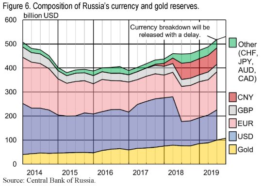 Non a caso, un anno prima, la Russia annunciò di avere aggiunto lo yuan (CNY) nelle sue riserve estere, dopo aver firmato un accordo di currency swap nel 2014. All’inizio la quota di yuan era modesta, ma nel secondo quarto del 2018 la Russia ha intensificato la sostituzione, nelle riserve estere, di dollari con euro e yuan. Quest’ultimo è arrivato a rappresentare il 15% delle riserve estere russe, a fronte di una media del 2% nelle altre banche centrali. A metà giugno 2019 la Russia aveva 68 miliardi di dollari di riserve denominate in yuan a fronte dei complessivi 217 detenuti dalle 149 banche centrali che riportano i dati al Cofer del Fmi.