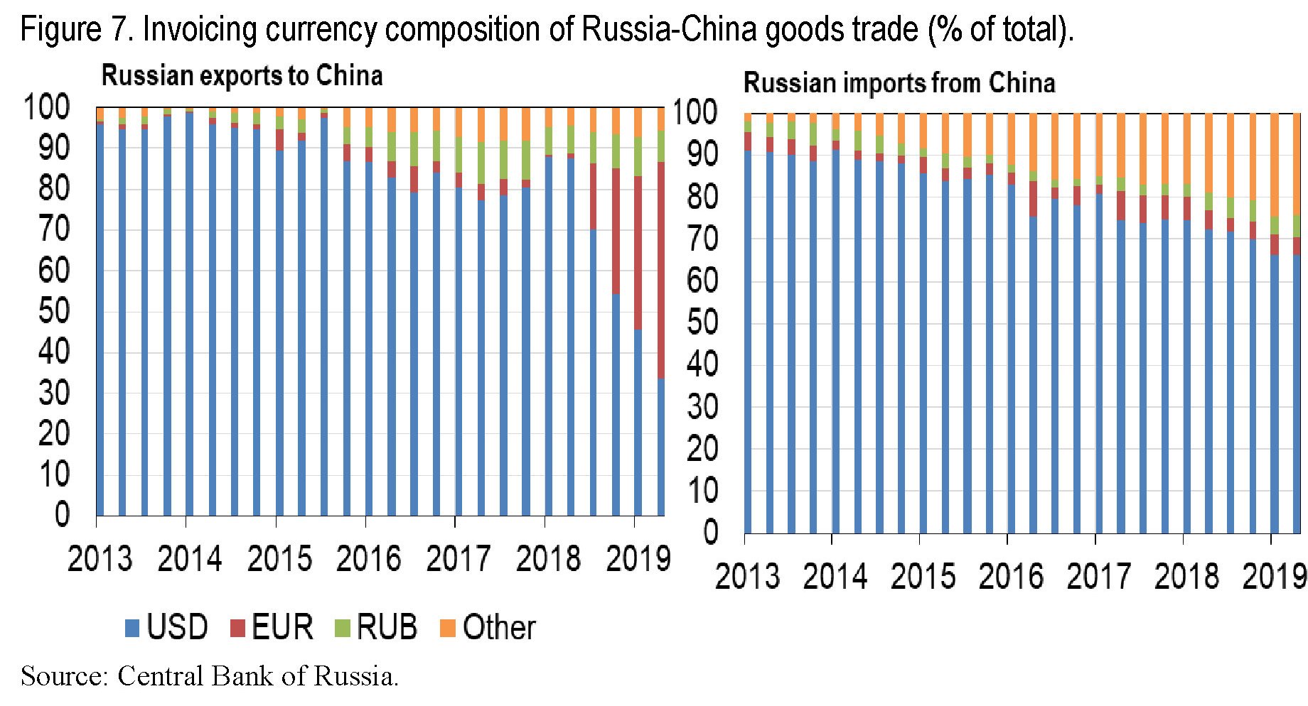 Ma aldilà del dato sulle riserve estere, è più interessante osservare che Russia e Cina hanno iniziato a usare meno dollari nelle transazioni reciproche. I dati della banca centrale russa mostrano che nella prima metà del 2019 solo il 39% dell’export russo verso la Cina era denominato in dollari, a fronte del 75% nel 2018. Una larga quota di questo export è stato denominato in euro (46% a metà 2019 a fronte del 12% nel 2018) e anche la quota di export denominato in rubli è cresciuta (9%). Il dollaro rimane invece la valuta principale di denominazione delle importazioni russe, pure se in calo (67% nel 2019 a fronte del 72% nel 2018).