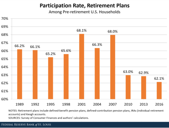 Essendo diseguaglianza e previdenza due feticci onnipresenti nel nostro dibattere contemporaneo, si capisce perché la Fed di St. Louis abbia dedicato una interessante ricognizione a una questione che in qualche modo è già contemporanea, pure se riguarda il futuro. Ossia il modo in cui gli anziani di domani si procacceranno di che vivere, visto che l’imprevidenza, piuttosto che il suo contrario, sembra guidi le scelte economiche di molti.