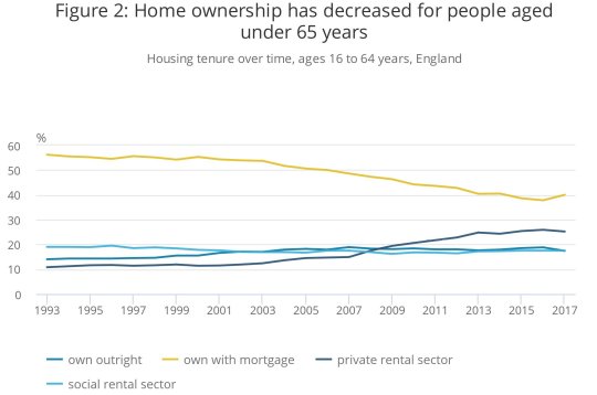 Questa norma produsse notevoli risultati anche perché nel 1979 circa un terzo (il 33,2%) delle abitazioni del paese erano di edilizia popolare, retaggio delle politiche sociali del passato. Ma questa quota – che rappresenta sostanzialmente il patrimonio “vendibile” a prezzi ridotti – si era già ridotta al 24,9% nel 1990, arrivando al 17,6% nel 2017. Ciò significa che proprio mentre gli anziani aumentano, ci sono meno case “economiche” da vendere ai meno abbienti.