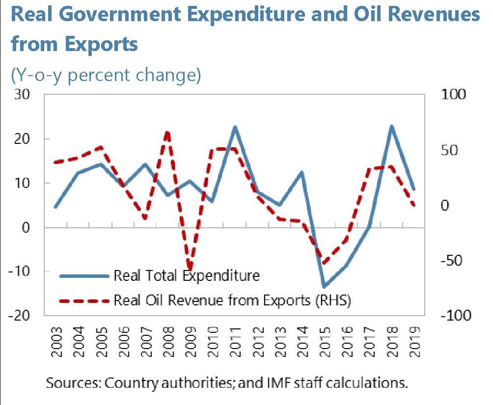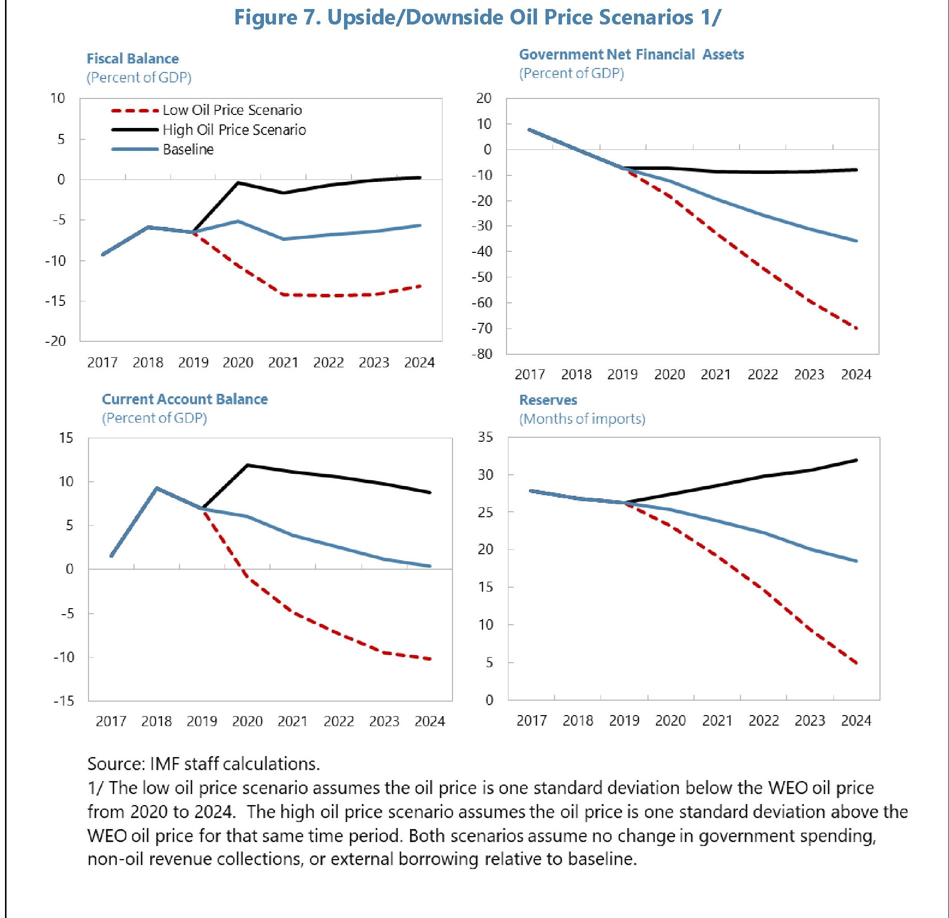 Altresì, risulta poco convincente l’affermazione delle autorità del paese secondo le quali a minor entrate faranno corrispondere minori spese. Non tanto perché il paese è impegnato in una lunga e costosa trasformazione finalizzata a promuovere un’economia alternativa a quella del greggio, ma perché la storia racconta che la spesa, per quanto prociclica rispetto alle entrate, sconta sempre un certo tempo di adeguamento.