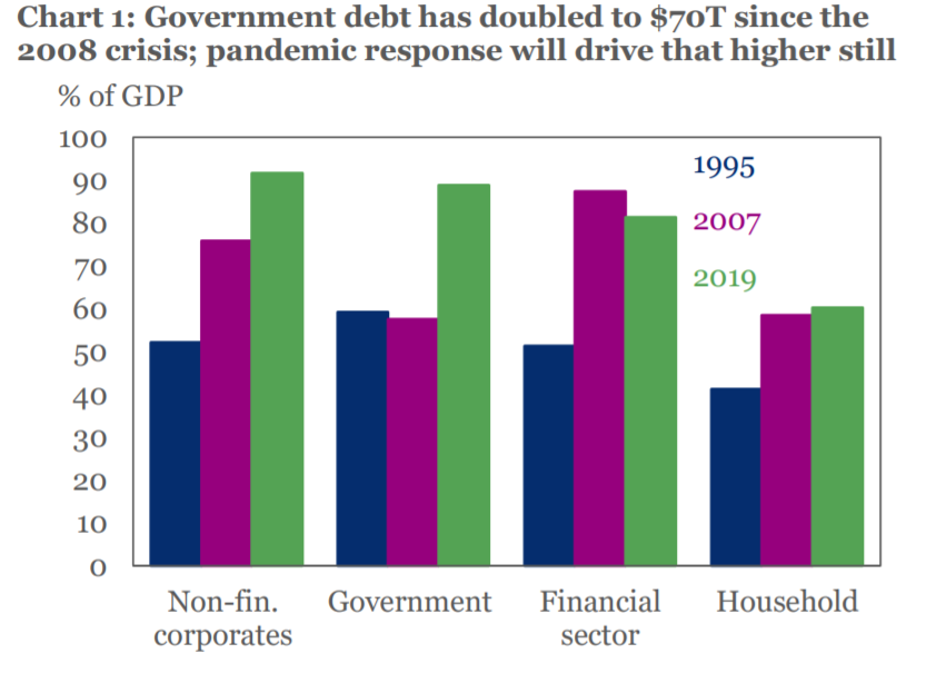Per cronaca, val la pena sottolineare che la parte del leone, in questa montagna di debiti, la fanno i governi (da 35 trilioni nel 2007 a 70) e il settore corporate (74 trilioni, il 92% del pil).