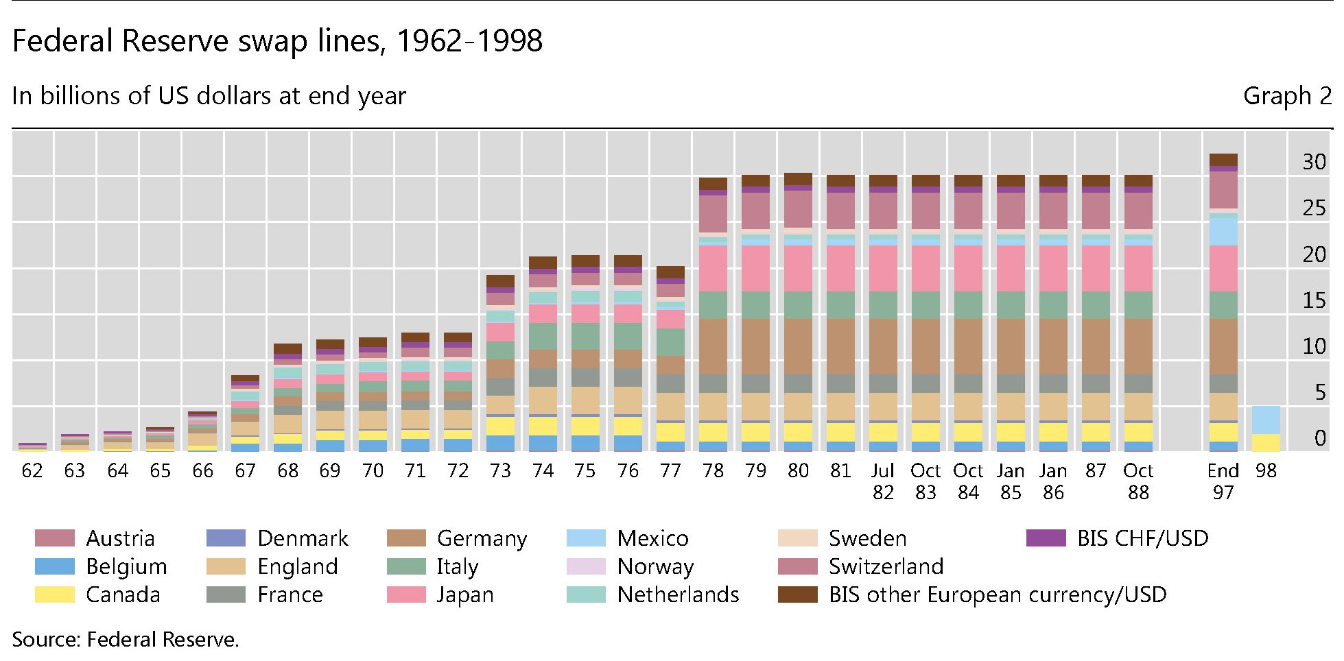 Soltanto nel 1962 la Fed istituì un sistema organizzato di swap bilaterali, che trovavano qualche precedente un paio di anni prima negli scambi valutari con la banca centrale svizzera. I banchieri centrali Usa iniziarono una specie di tour fra le banche centrali europee, riuscendo a convincerne sette e dopo di loro anche la Bank of Canada e la Bank of Japan. Nacquero così degli open swap facility da 50-100 milioni di dollari ognuno.