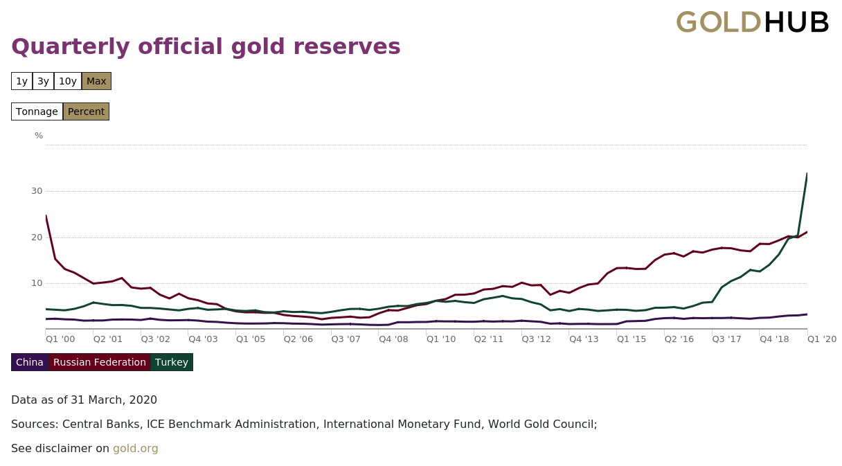 La Turchia, che ancora nell’aprile scorso ha aumentato la sua quantità di oro, ormai quota 524 tonnellate che equivalgono al 36% delle sue riserve. La Cina sfiora le 2.000 tonnellate, la Russia le 2.300. Ma in relazione agli asset complessivi, l’oro cinese pesa poco più del 3%, quello russo oltre il 20. Quindi è la Turchia ad essersi sbilanciate più delle altre verso il metallo giallo.