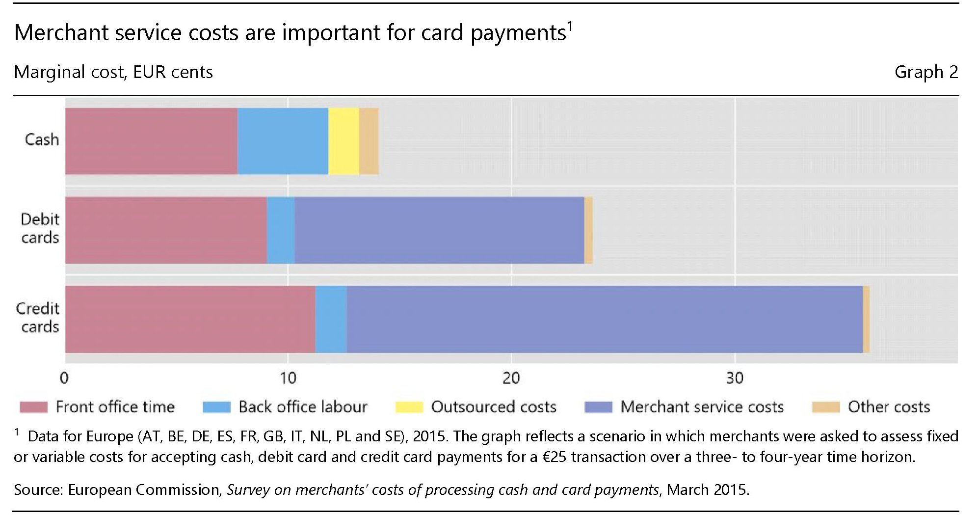Come si può osservare dal grafico sopra, il contante è ancora il mezzo più conveniente, per l’economia in generale rispetto alle carte elettroniche. Si tratta di costi “invisibili” per il consumatore, ma comunque di costi che devono essere gestiti e che in gran parte ricadono sui venditori o sul sistema bancario. Che quindi hanno tutto l’interesse ad abbatterli.