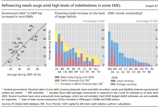 La Bis, nella sua ultima Rassegna trimestrale, stima che in media fra gli Emergenti censiti, i rifinanziamenti peseranno importi pari a circa il 10% del pil, con punte del 20 per alcuni. La crisi inoltre potrebbe costringere i governi a dover attivare le garanzie offerte, specie alle imprese a capitale pubblico (SOEs) che in molti paesi (grafico sopra a destra) esibiscono un livello importante di debito e magari producono materie prime che stanno soffrendo pressioni deflazionistiche dall’inizio della crisi.