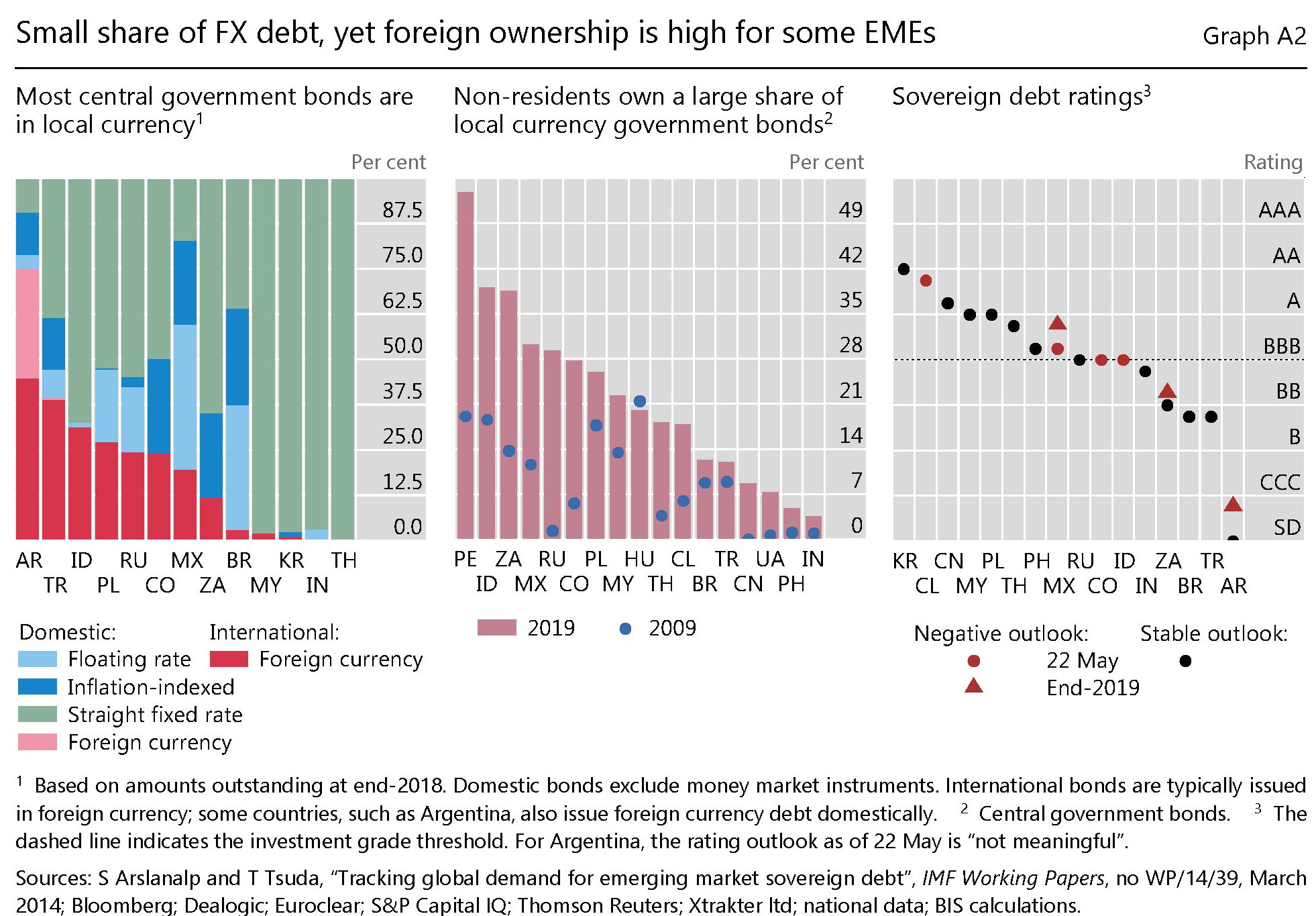 La Bis stima che circa il 20% del debito sovrano, in aggregato (grafico sopra pannello centrale), sia detenuto da non residenti, una quota raddoppiata dal 10% di dieci anni fa. Che è un fatto positivo, per questa economia, tranne quando parte il panico, come è accaduto anche di recente. Se a ciò si aggiunge che vendendo i bond all’estero questi paesi devono esibire un rating soddisfacente per non pagare troppo salato il sostegno degli investitori, il quadro si completa. Un eventuale downgrade sotto il livello investment grade sarebbe per queste economia una iattura peggiore del Covid. Perché il virus prima o poi sparirà. Lo stigma è più persistente.