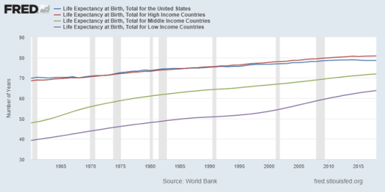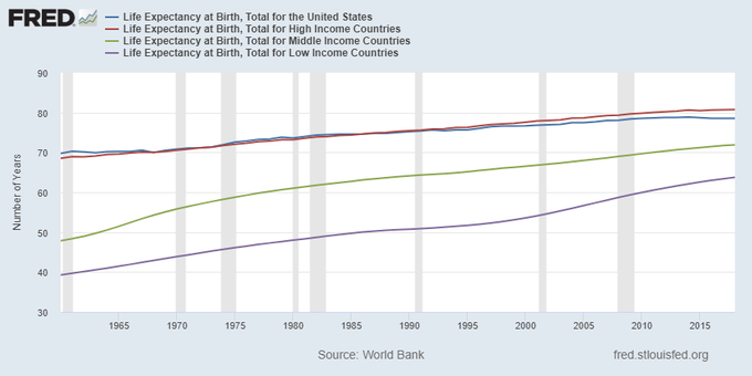 Non solo. Come ultima osservazione, che dovrebbe essere tenuta a mente dai tanti che lamentano i guasti della globalizzazione, vale la pena sottolineare i progressi in tema di longevità fatti dai paesi a basso e medio reddito. Negli anni ’60 l’aspettativa di vita era rispettivamente di 39 e 47 anni. Nel 2018 – ultimo aggiornamento dei dati – siamo arrivati a 63 e 71. Forse il capitalismo non è cattivo come dicono.
