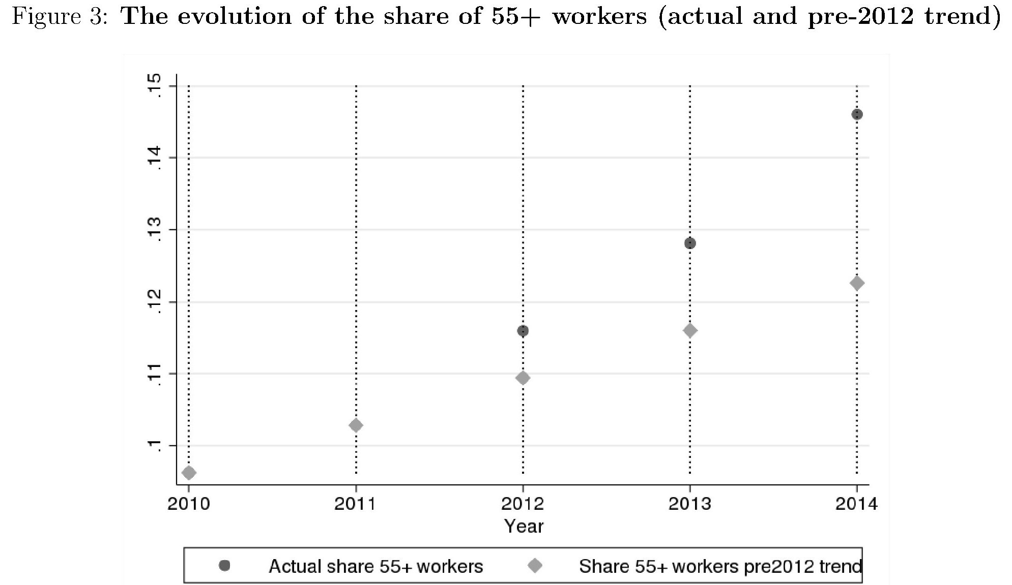 In sostanza la Fornero innalzò sensibilmente i requisiti sia per le pensioni di vecchiaia che per quelle di anzianità, generando non poche polemiche. Il seguito della storia è noto, ed è inutile tornarci qui. Più interessante osservare le simulazioni svolte dagli autori del paper che ci consentono di apprezzare l’effetto avuto sulla quota di over 55 in attività.