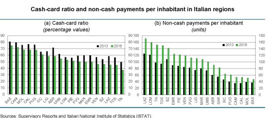 Bankitalia nota che nel periodo considerato “la domanda di contante a fini di transazione misurata dal il rapporto cash-card è diminuito in tutte le regioni italiane”, anche se nel Meridione questo rapporto “è rimasto sostanzialmente più alto della media nazionale”.