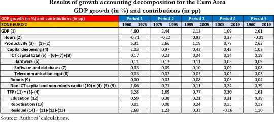 Assai meno importante, tranne che in certi periodi e per determinati paesi – Germania e Giappone fra le metà dei Settanta e la metà dei Novanta, Francia e Italia fra la metà dei novanta e il 2005 – il contributo dei robot, mentre quello della rivoluzione tecnologica è stato ancor minore.