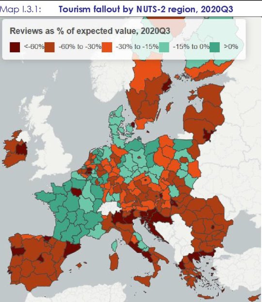 Per completare il panel dei dati la Commissione ha anche attinto alle informazioni residenti sui siti che forniscono servizi di prenotazione, come AirBnB. Qui la devastazione è stata ancora maggiore. All’apice della crisi, in aprile, i clienti del portale erano solo il 4% del livello atteso. Ad agosto erano arrivati al 70% delle previsioni, basata sui dati 2019, e appena i timori della pandemia si sono riaccesi, sono crollati al 45%. Da gennaio a settembre questi flussi sono risultati essere la metà di quanto avrebbero dovuto secondo le stime previsionali. Ovviamente anche qui con grandi differenze regionali, riepilogate nella mappa sotto.