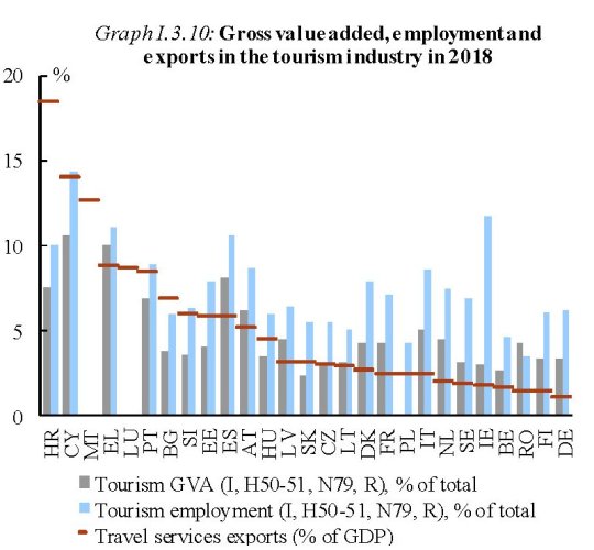 Bene perciò ha fatto la Commissione Ue a dedicare alcune pagine della sue previsioni di autunno all’analisi dei dati del turismo in questi tempi amari. Anche perché malgrado lo si consideri bene voluttuario, o forse proprio per questo, il turismo esprime un valore aggiunto di tutto rispetto, e contribuisce significativamente all’occupazione, come si può intuire osservando il grafico sotto, costruito con dati del 2018.