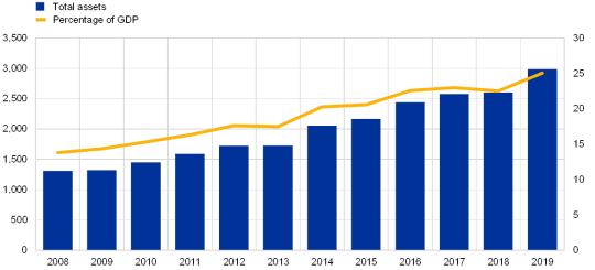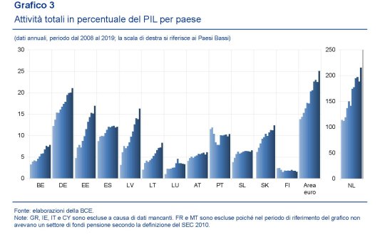Il secondo dato è l’entità crescente di questi asset. “Dal 2008 le attività dei fondi pensione dell’area dell’euro sono quasi raddoppiate in termini di dimensioni: le attività totali sono attualmente pari a circa 3.000 miliardi di euro e la loro percentuale rispetto al PIL dell’area è pressoché raddoppiata, passando dal 13 per cento nel 2008 al 25 per cento nel 2019”, scrive la Bce.
