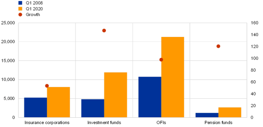 Una crescita sicuramente rilevante, ma che va inquadrata in relazione al peso specifico che i fondi pensioni hanno nel panorama finanziario europeo, rispetto alle altre istituzioni finanziarie non monetarie.