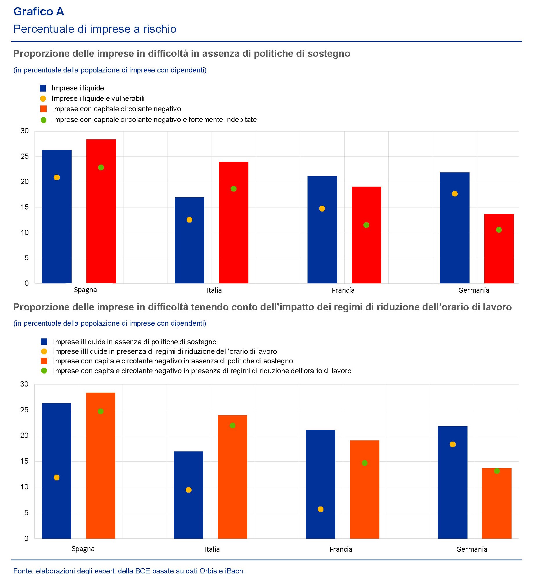 A tal proposito, la Bce ha provato a fare due conti incrociando alcuni database riferiti a Spagna, Germania, Francia e Italia. E’ emerso che in Spagna il 25% della popolazione delle imprese – che valgono il 28% dei dipendenti globali – è a rischio di illiquidità se non vengono adottate politiche di sostegno.