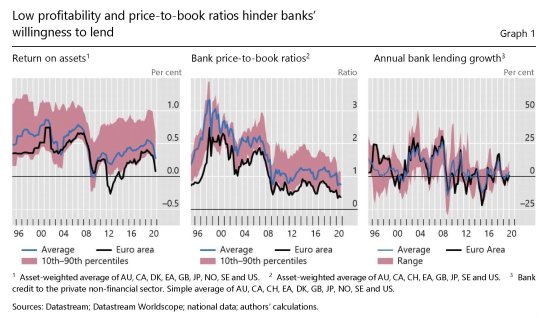 Questo declinare dei tassi, che erode la profittabilità, determina a sua volta un assottigliarsi delle valutazioni del valore azionario delle banche, col risultato di far diminuire il price-to-book ratio e quindi – indirettamente – favorire la distribuzione di dividendi pure se ciò diminuisce la loro capacità di dare a prestito. Ed ecco il dilemma apparire nella sua drammatica chiarezza.
