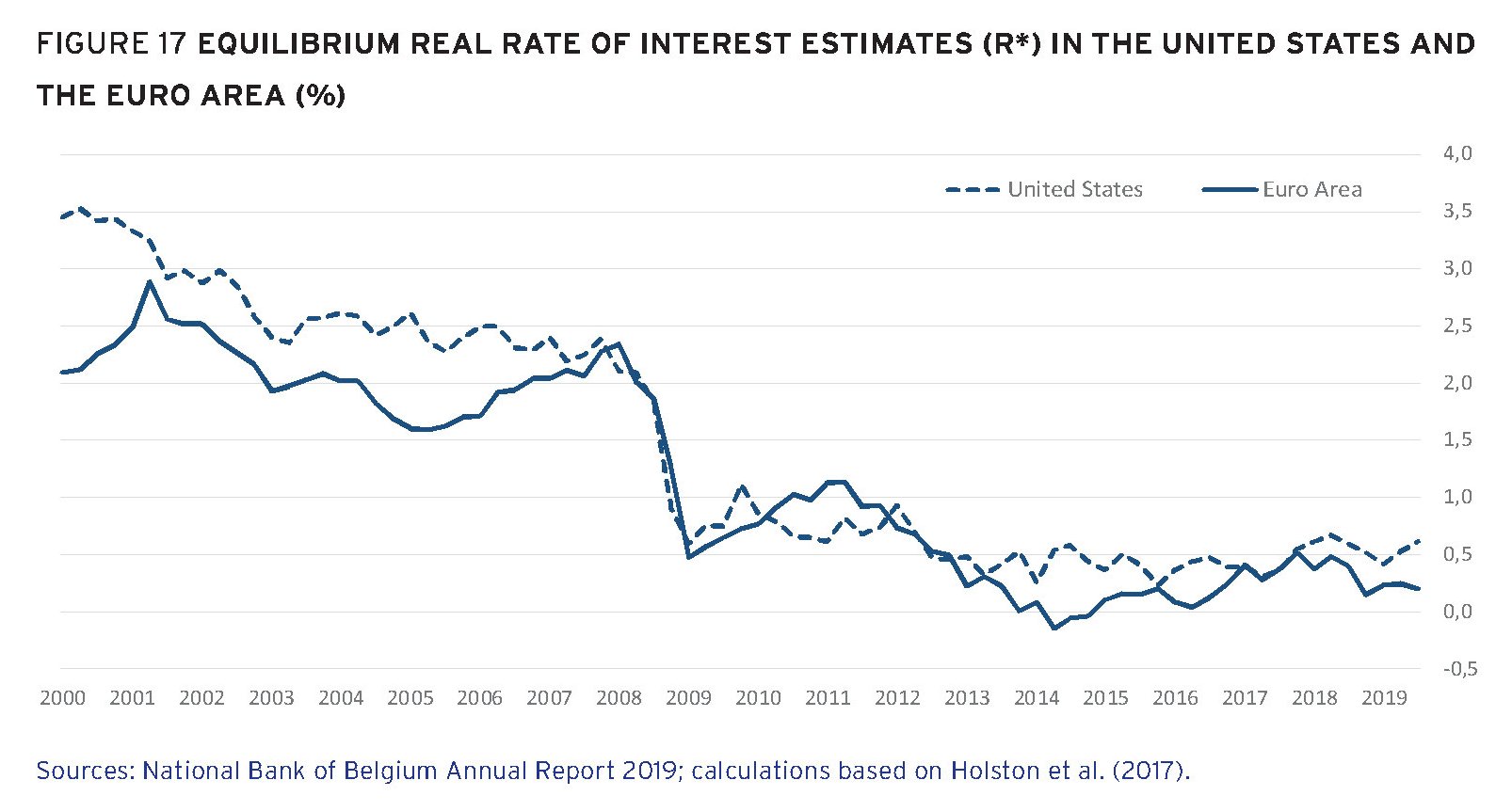 R*, insomma, “ha lo scopo di catturare il tasso di rendimento (reale) di equilibrio di un safe asset”. Pur ricordando che “R* non è osservabile”, in ogni caso la “sua stima fornisce un utile indicatore per la politica monetaria poiché coglie il livello del tasso di interesse al quale la politica monetaria può essere considerata neutra (cioè né espansiva né restrittiva). Quindi, quando l’economia sta sotto il potenziale, spingendo i tassi ufficiali reali sufficientemente al di sotto di R * si rende la politica espansiva, nel senso di stimolare la crescita della spesa oltre la crescita potenziale del prodotto. L’opposto si applica quando l’economia si surriscalda”.