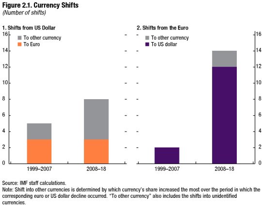L’euro infatti, almeno per il momento, non sembra scaldare il cuore – e tantomeno il portafogli – dei banchieri russi. Probabilmente l’eurozona sconta ancora la crisi di fiducia che dopo il 2010 condusse sull’orlo del crack la moneta unica. Non a caso il Fmi dedica alla crisi dell’euro un approfondimento, dove si osserva un “declino della quota dell’euro nei portafogli delle riserve valutarie”.