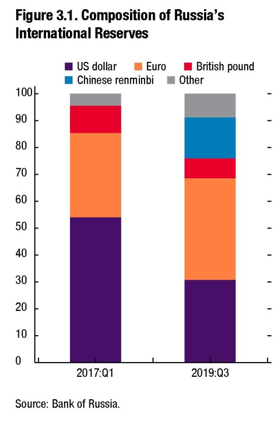 La novità, quindi, non è tanto che la Russia venda dollari, come probabile reazione all’aumento delle sanzioni Usa: circa il 26% di calo dal 2017. La cosa interessante è osservare che i dollari sono stati sostituiti in gran parte da renmimbi, che fino a tre anni erano del tutto assenti fra gli asset di riserva, e solo parzialmente da euro. La banca centrale russa, inoltre, ha alleggerito notevolmente anche la sua posizione in sterline.