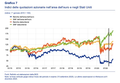 Ancora di recente la borsa americana, del tutto incurante dei torbidi politici, ha superato se stessa inanellando nuovi record. La pandemia, per gli indici, è già un ricordo, pure se ancora il mondo v’è imprigionato dentro, perché i mercati, come sempre occhiuti, già incamerano la ripresa che verrà e stappano champagne. C’è però un ma, che si osserva guardando le perfomance assai diverse fra le azioni delle banche e quelle delle imprese non finanziarie. A bene vedere, sono solo quest’ultime che festeggiano. Le banche stano in un cantuccio, ben lontane dai livelli pre Covid. Per loro la festa non è ancora cominciata. E visto il livello durevolmente baso dei tassi di interesse, è probabile che non comincerà tanto presto. A ognuno la sua pandemia, insomma. Per quella delle banche, il vaccino ancora non si è trovato.
