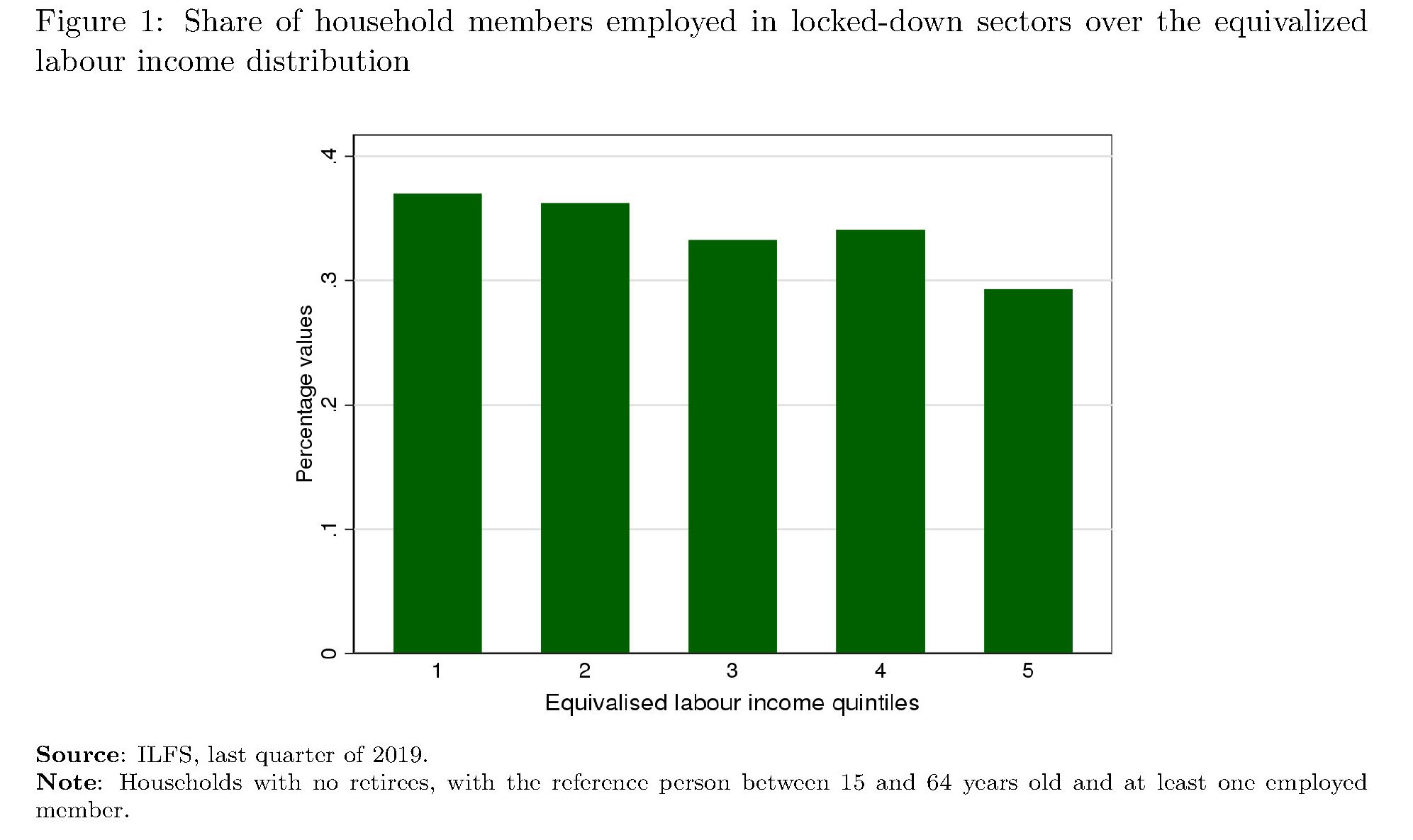 Sulla base di queste premesse, il lavoro ha dedotto che il lockdown, come era facile immaginare, ha colpito più duramente le famiglie più povere, per le quali è più elevata la possibilità di essere impiegate nei settori non essenziali e che hanno meno possibilità di lavorare da casa. Non a caso la quota di famiglie impiegate nei settori colpiti dal lockdown è più elevata nel primo quintile di reddito, quindi quello più basso.