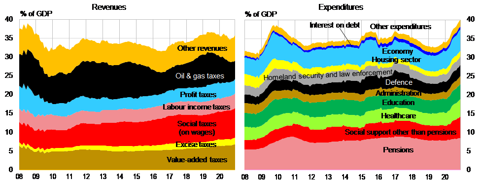 Ovviamente il calo delle entrate fiscali è stato determinato in larga parte dei minori introiti energetici. A ciò si aggiunga che la spesa pubblica, per fronteggiare l’epidemia, è cresciuta del 14%, portando il rapporto di quest’ultima sul pil al 40%, livello osservato solo durante la crisi del 1998 e del 2009.