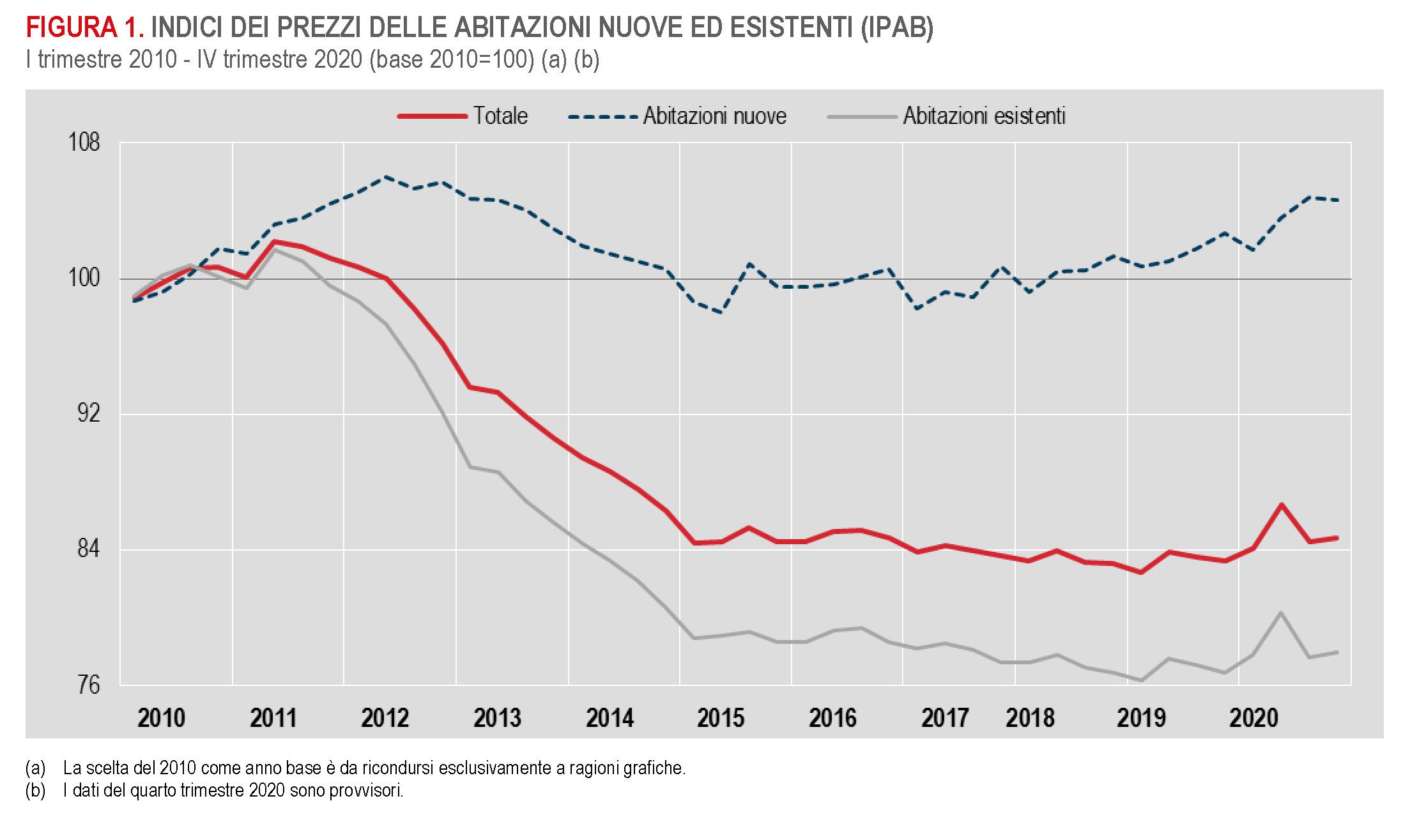 La tabella sopra offre un rapido riepilogo. Ciò che possiamo dedurne è che per le abitazioni esistenti il guadagno complessivo dell’anno scorso non è bastato a recuperare il livello del 2015. Le abitazioni nuove hanno recuperato circa il 5%, pure se nell’ultimo trimestre 2020 hanno visto un lieve calo.