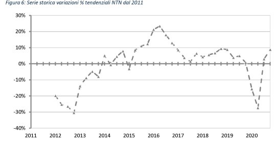 Dal grafico si osserva che il mini rimbalzo trimestrale ha riportato il numero di compravendite al livello del 2018, da dove aveva iniziato la sua discesa poi divenuta un crollo a causa della pandemia.